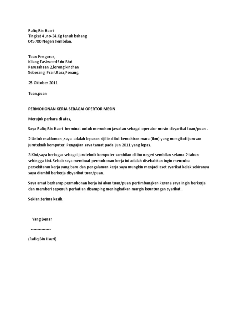 Surat Rasmi Memohon Pekerjaan Sebagai Juruteknik Nitasulistx